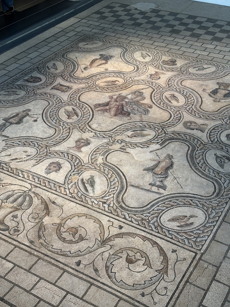 It begins with a bold, contemporary exterior. At first, I wondered “am I at the right place?” It seems an unlikely packaging for Roman artifacts, but this ripped, shimmering glass façade was inspired by Roman togas! Very clever! French-Brazilian architect Elizabeth de Portzamparc made the conscious decision to not compete with the iconic Roman Arena that faces the museum. She wanted to show that history is relevant and remains visually alive today. Bravo for the exterior, but what would I find inside?